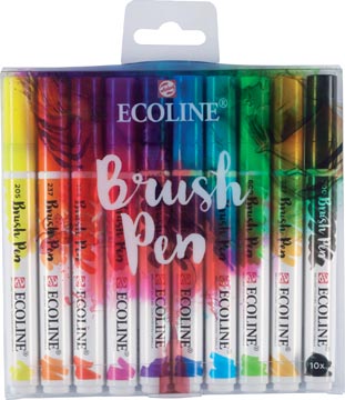 In een ophangetui.10 stiften in geassorteerde kleuren: geel, oranje, rood, roze, paars, donkerblauw, lichtblauw, groen, oker en zwart